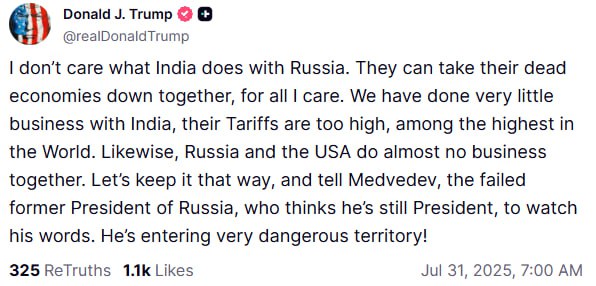 „La fel, Rusia și SUA nu fac aproape deloc afaceri împreună. Să rămână așa și să-i spunem lui Medvedev, fostul președinte eșuat al Rusiei, care crede că este încă președinte, să-și măsoare cuvintele. Intră pe un teritoriu foarte periculos!”