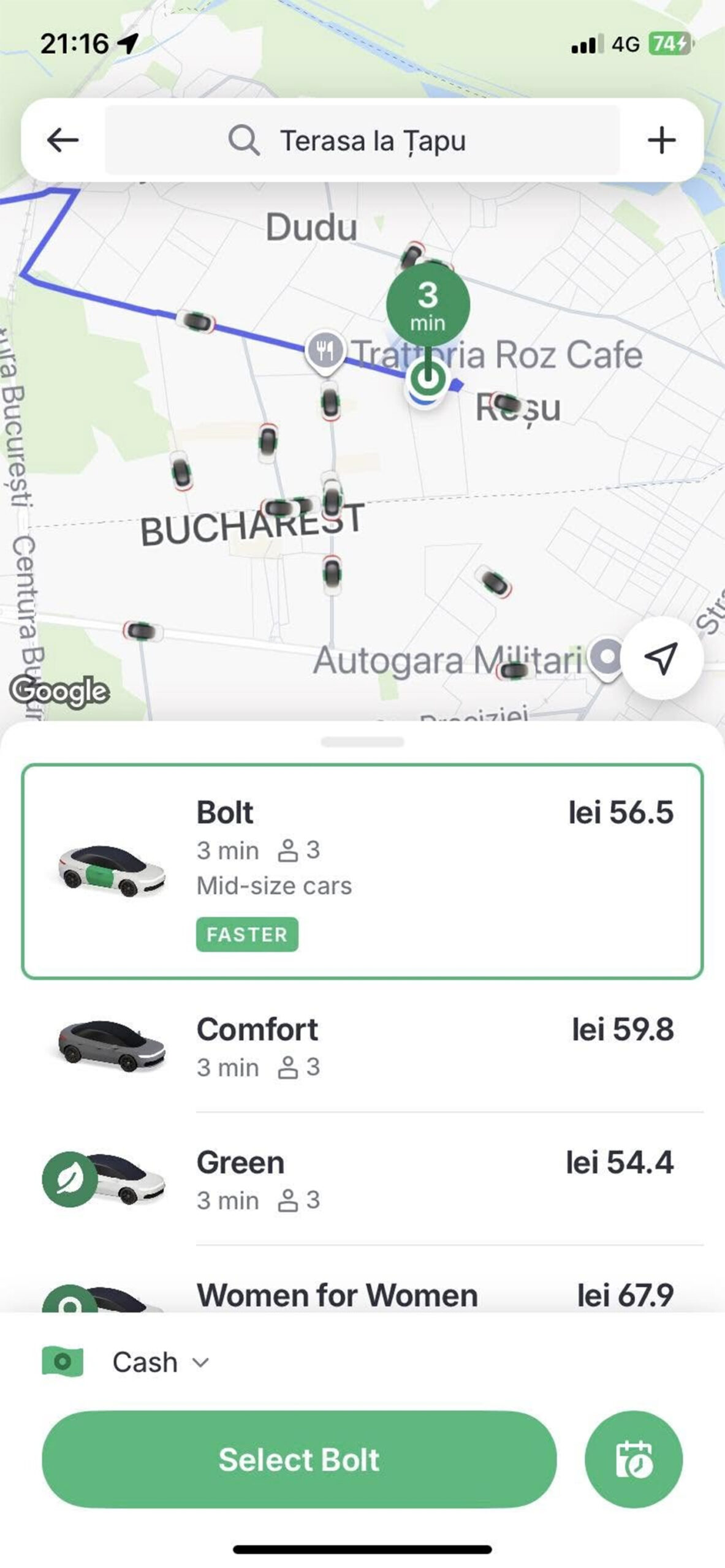 În cazul cursei Bolt, aplicația arătase un tarif de 56,5 lei pentru 16 kilometri, comisionul fiind inclus. Mai existau variante, precum Comfort (59,8 lei), Green (54,5 lei), dar și Women for Women (67,9 lei).