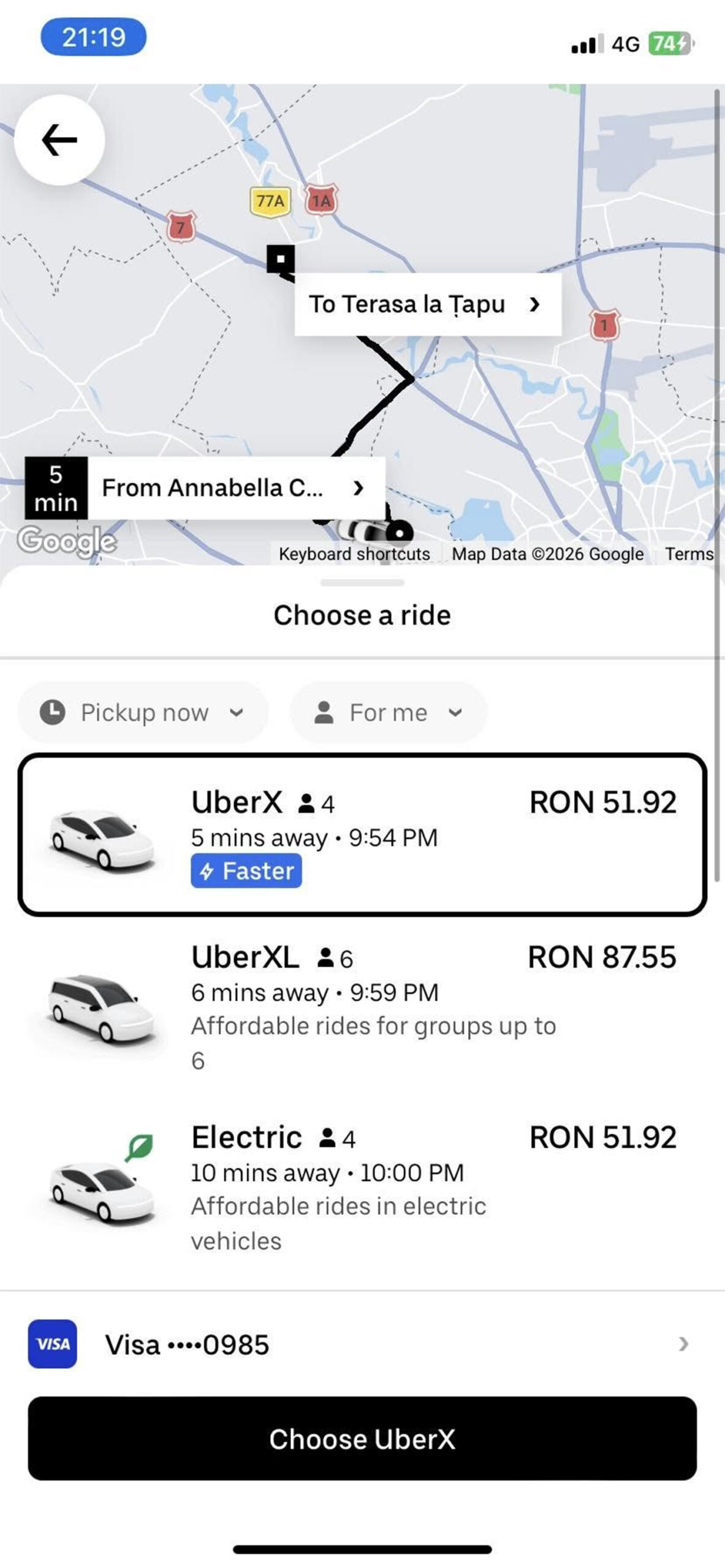 În aplicația Uber, clientului i-a apărut prețul de 51,92 lei pentru cursa de 16 kilometri de la ora 21:54. Pentru varianta UberXL, prețul era de 87,55 lei, iar varianta Electric avea prețul de 51,92 lei, identic cu tariful pentru UberX.