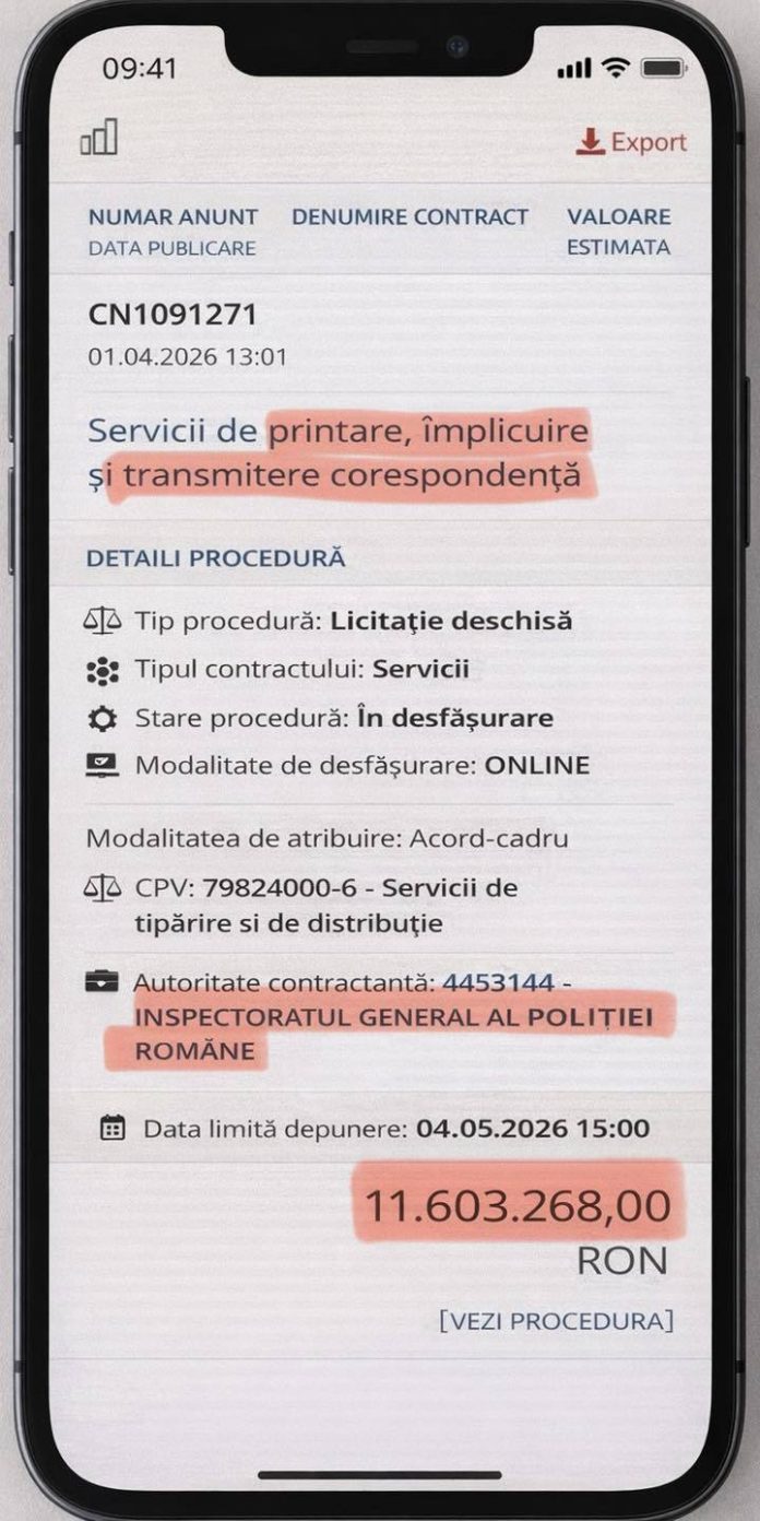 Sindicatul Europol anunţă, joi, că Poliţia Română a lansat o procedură de licitaţie în valoare de 2,2 milioane de euro pentru printare, împlicuire şi transmitere de corespondenţă, cheltuială considerată ”o sfidare”, în condiţiile în care autospecialele nu au revizie tehnică, iar structurile nu au toner la imprimantă.