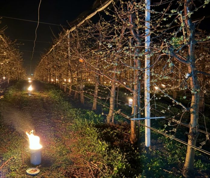 Cele 4.000 de lumânări au ridicat temperatura din livadă cu câteva grade, suficient pentru a proteja florile fragile de îngheț.