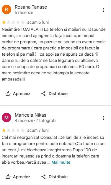Mărturiile românilor pe care i-am întâlnit sunt identice cu sutele de recenzii negative lăsate pe Google, la adresa consulatului.