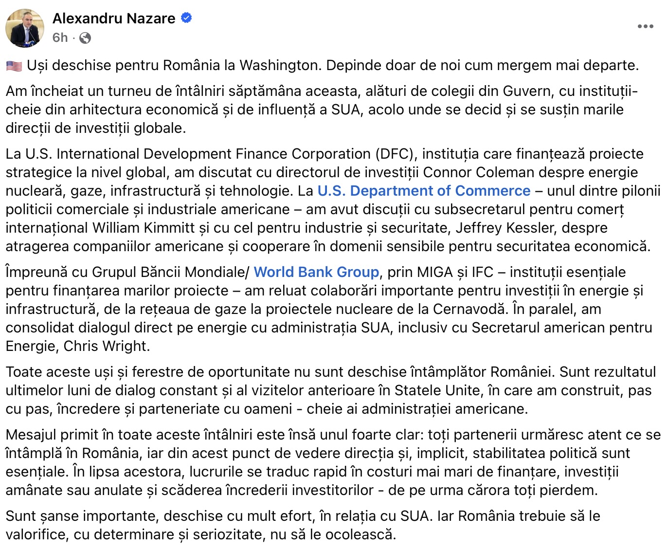 „Uși deschise pentru România la Washington. Depinde doar de noi cum mergem mai departe. Am încheiat un turneu de întâlniri săptămâna aceasta, alături de colegii din Guvern, cu instituții-cheie din arhitectura economică și de influență a SUA, acolo unde se decid și se susțin marile direcții de investiții globale”, a scris Nazare pe Facebook.