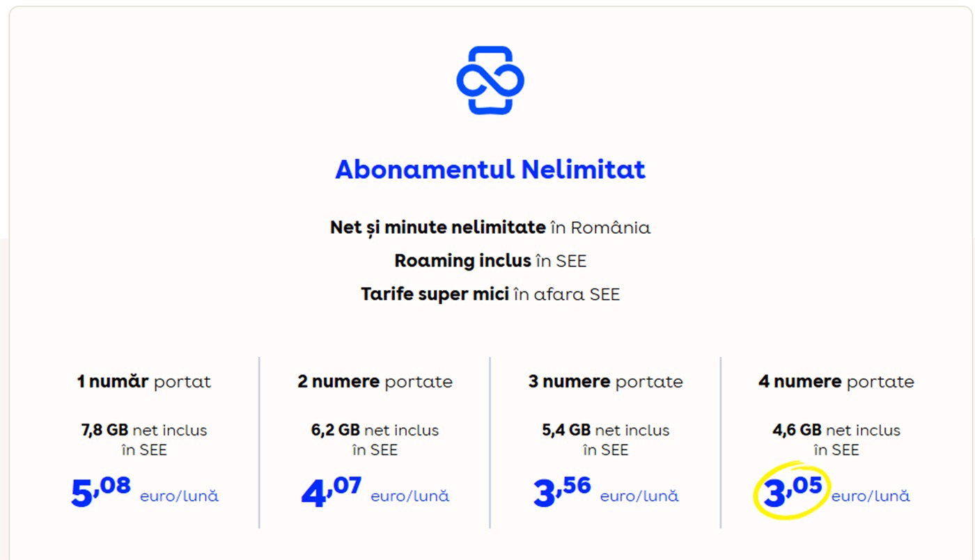 Pentru 4 numere portate, cu 4,6 GB net inclus în SEE, prețul abonamentului este de 3,05 euro pe lună (15,53 lei/lună).