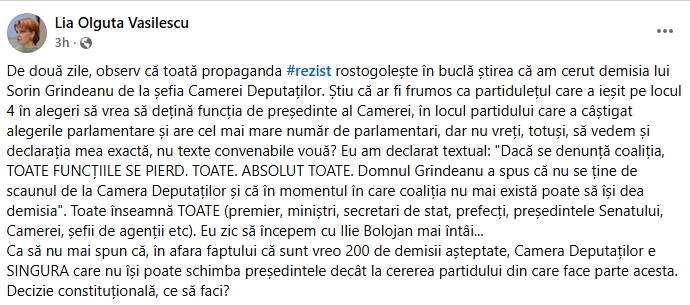 Lia Olguța Vasilescu, primar al Craiovei și una dintre vocile importante din PSD, a postat un mesaj pe pagina sa de Facebook, prin care susține că gruparea #rezist a interpretat greșit o declarație dată de aceasta în spațiul public, cu privire la faptul că Sorin Grindeanu ar trebui să îți dea demisia de la șefia Camerei Deputaților.