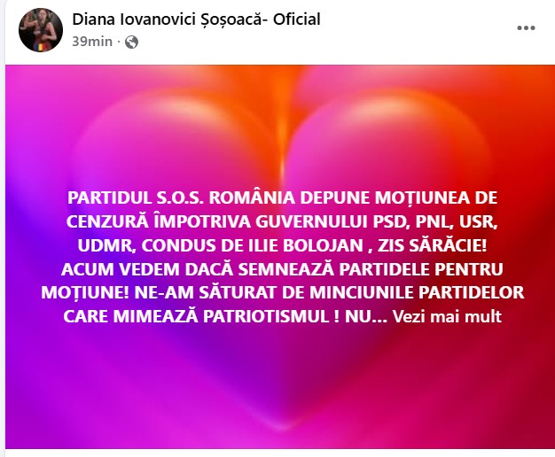 „NU VREȚI NICIUNUL SĂ FORMULAȚI MOȚIUNEA??? O FACEM NOI! VOI SEMNAȚI-O! ADEVĂRUL NE VA ELIBERA! TOTUL PENTRU ROMÂNIA!”, mai scrie Şoşoacă.