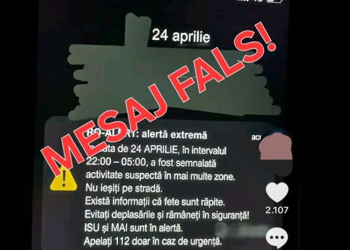 Ministerul Afacerilor Interne a atras atenția, sâmbătă, asupra unui mesaj fals care circulă în mediul online și este atribuit în mod eronat sistemului RO-Alert, având scopul de a induce panică în rândul populației.