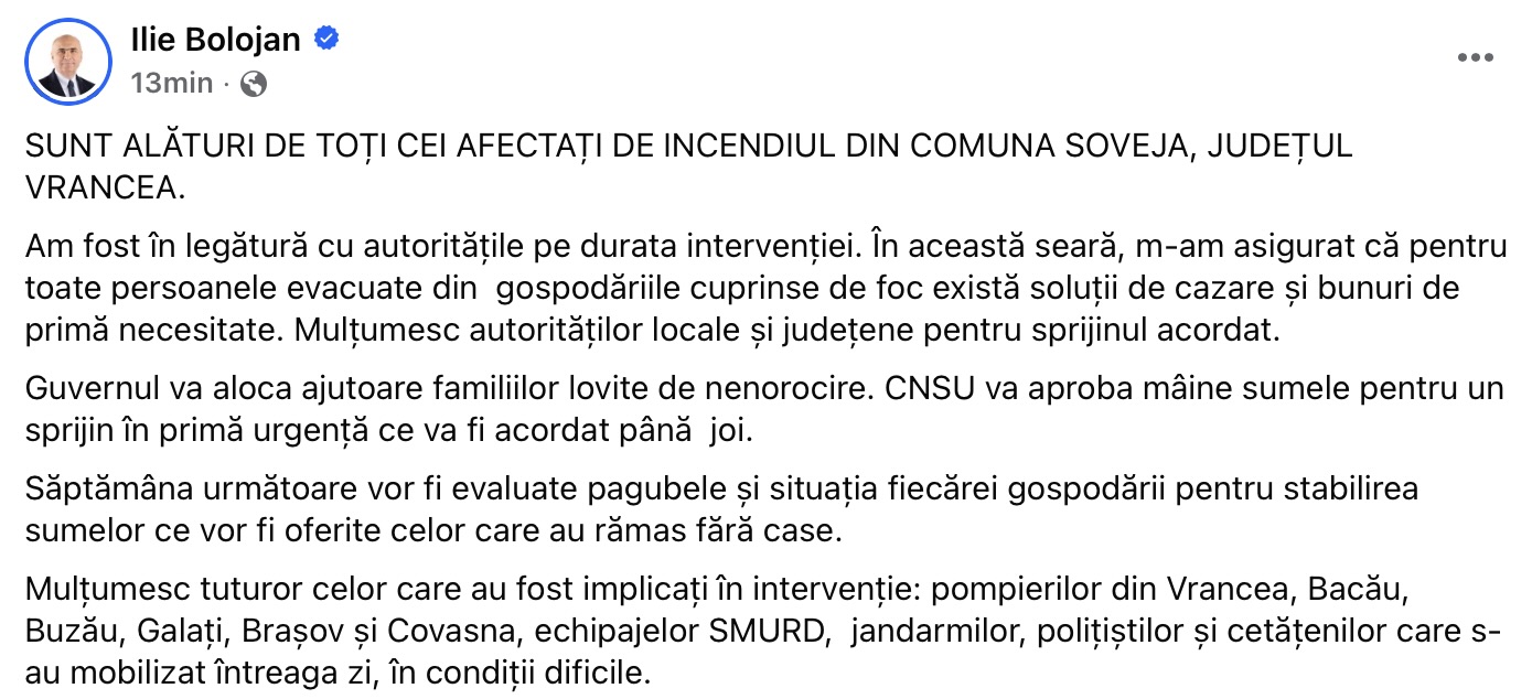 După incendiul de proporții din comuna Soveja, județul Vrancea, în care zeci de locuințe au fost mistuite de flăcări și sute de persoane au fost evacuate, Ilie Bolojan a transmis un mesaj de solidaritate și sprijin pentru familiile afectate, anunțând totodată măsuri de ajutor de urgență și evaluare a pagubelor.